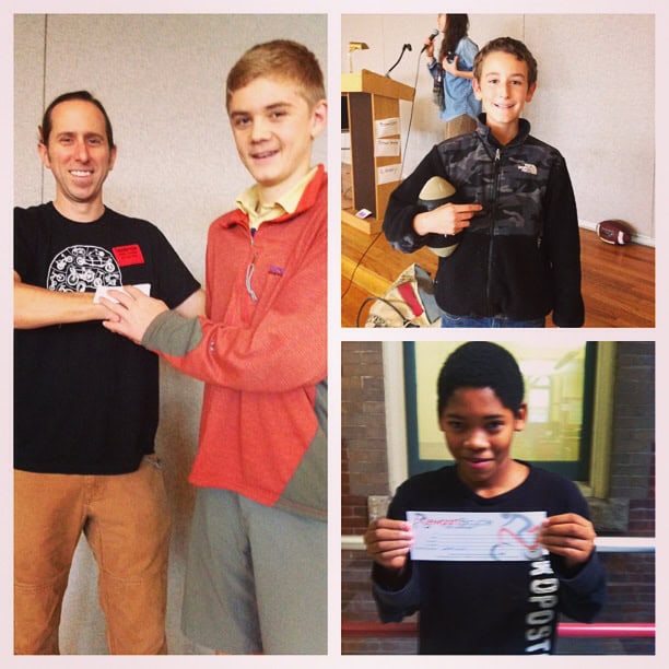 From late October to Thanksgiving break, we worked with Thompson Middle School to promote and inspire more biking and walking to school. Through daily encouragement and weekly raffles, over 25% of the student body participated. On Tuesday, Nov 25th, three grand prize winners were drawn from among the students who biked or walked the most during the challenge. Clockwise from top right: 5th grader Nathaniel Thompson received a $250 gift card to Ten Speed Spokes; Kaylon Samuels received a a $250 gift certificate to Newport Bicycle; and 8th grader Graeme Clougher, pictured with our own Director of Education Mark Chesterton, received a $250 gift card to Pedal Power in Middletown. The Bike and Walk to School Challenge was funded by a generous grant from the Safe Routes to School National Partnership. Celebrate kids moving in the morning!