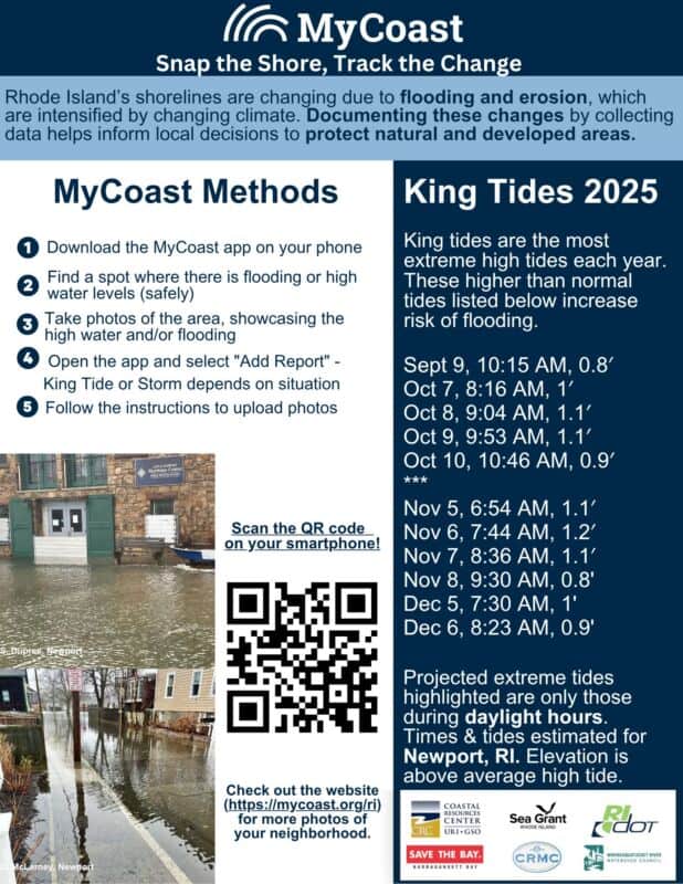 MyCoast works to build tools that engage the public to provide information to researchers, legislators, and planners to formulate solutions to environmental impacts on coastlines and waterways. Rhode Island Sea Grant and the Coastal Resources Center and other partners sponsor MyCoast in Rhode Island.