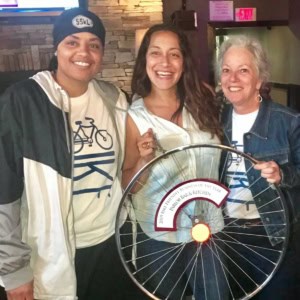 Kristen Mashaw (center) owner of Bike Friendly Business Parlor Bar & Kitchen with Bike Newport’s Allyson McCalla and Bari Freeman