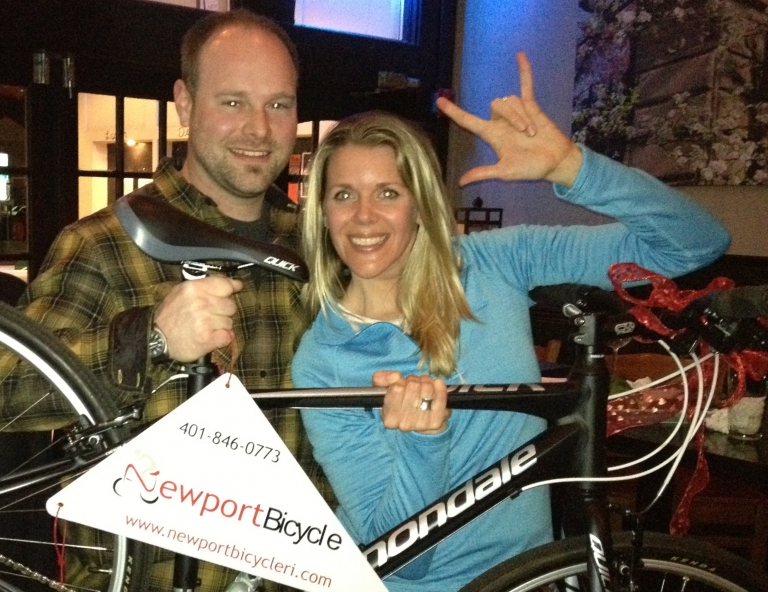 Thanks to all who came out for last night’s Bike Newport Night! Together we raised over $3000 for “Night Bright”: our inventory of night safety equipment for our bicycle-dependent workers. Many Bike Newport supporters left with arms and pockets heavier with raffle and silent auction prizes – including Grand Prize Winner Jen Sannes and her beautiful Cannondale courtesy of Newport Bicycle! (pictured here – Jen with her Cannondale and Braden of Newport Bicycle)